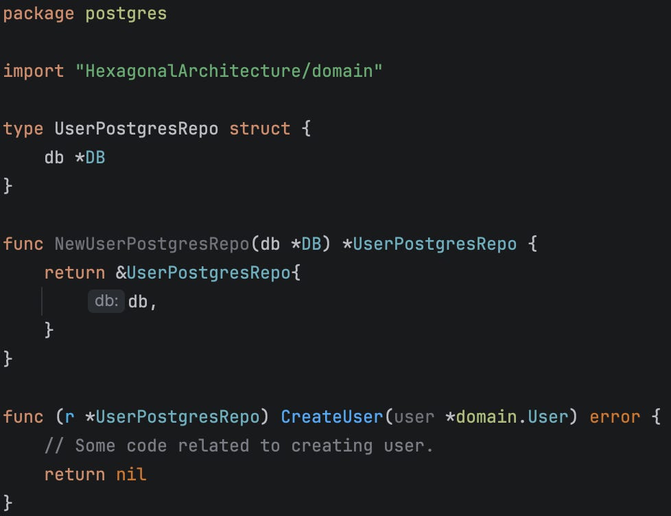 You can now see that UserPostgresRepo is fulfilling our port requirement by implementing UserRepo port.