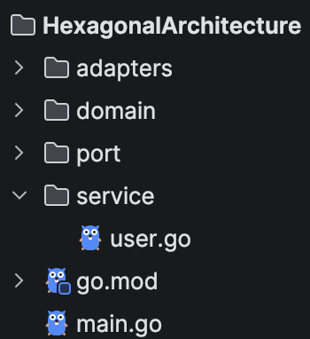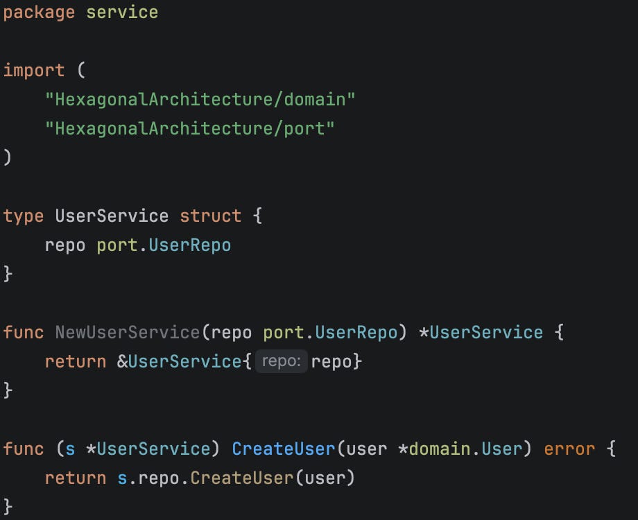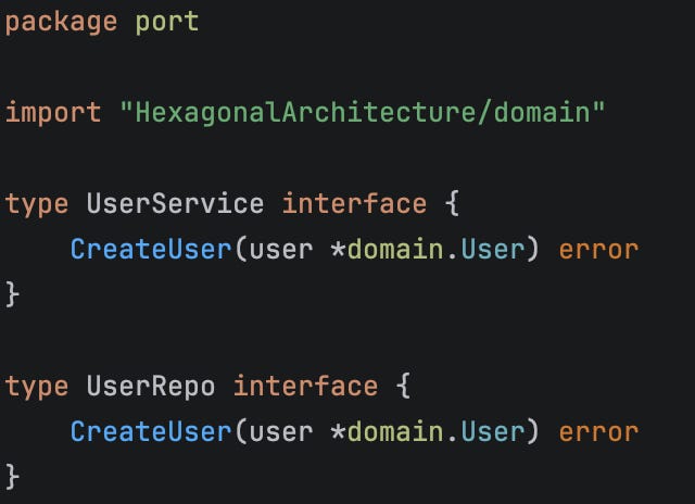 Here you can see that we defined UserService & UserRepo. We will focus more on UserRepo because UserService will have our business logic and nothing special to Hexagonal Architecture.