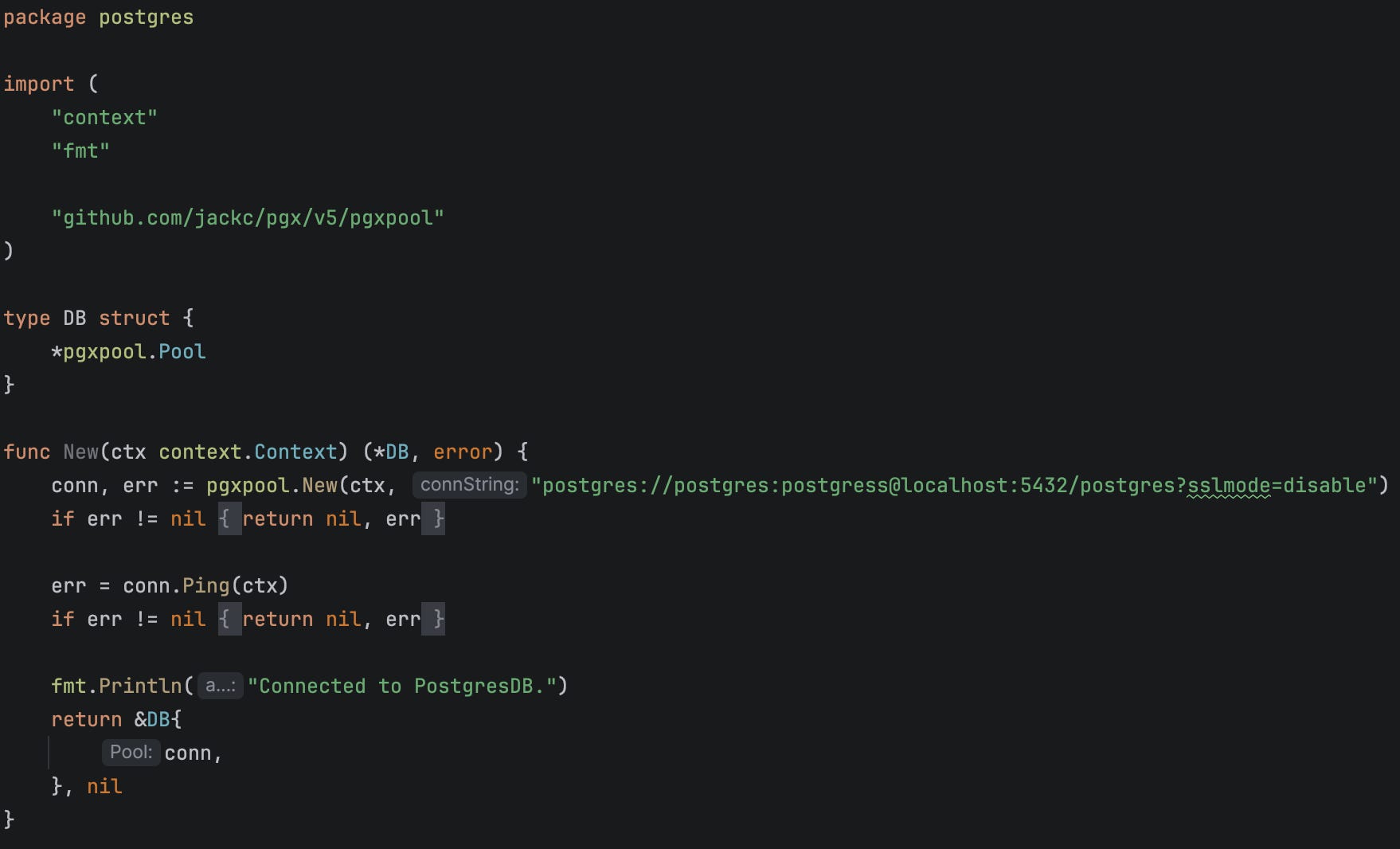 I’ve created a folder postgres inside adapter and a file db.go with the following content.